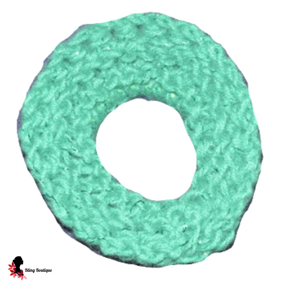 Hand knitted with a green sparkle yarn on a goodie ouchless band.