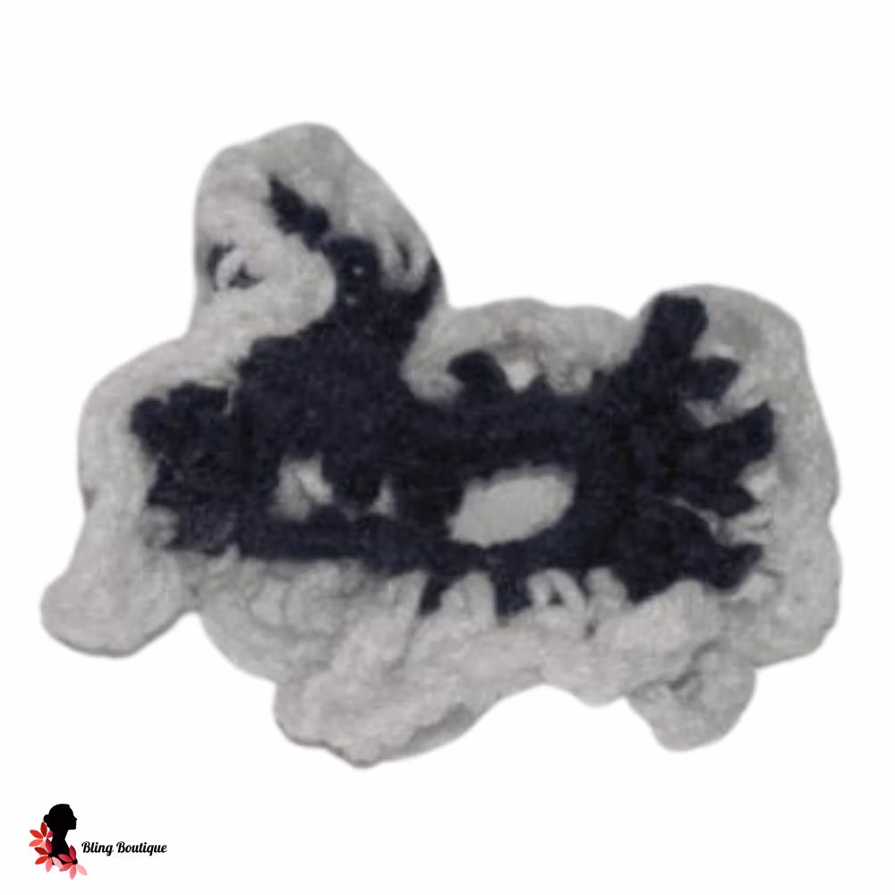 Hand-crocheted on a Goodie Ouchless Band, this item measures about 4 inches across.