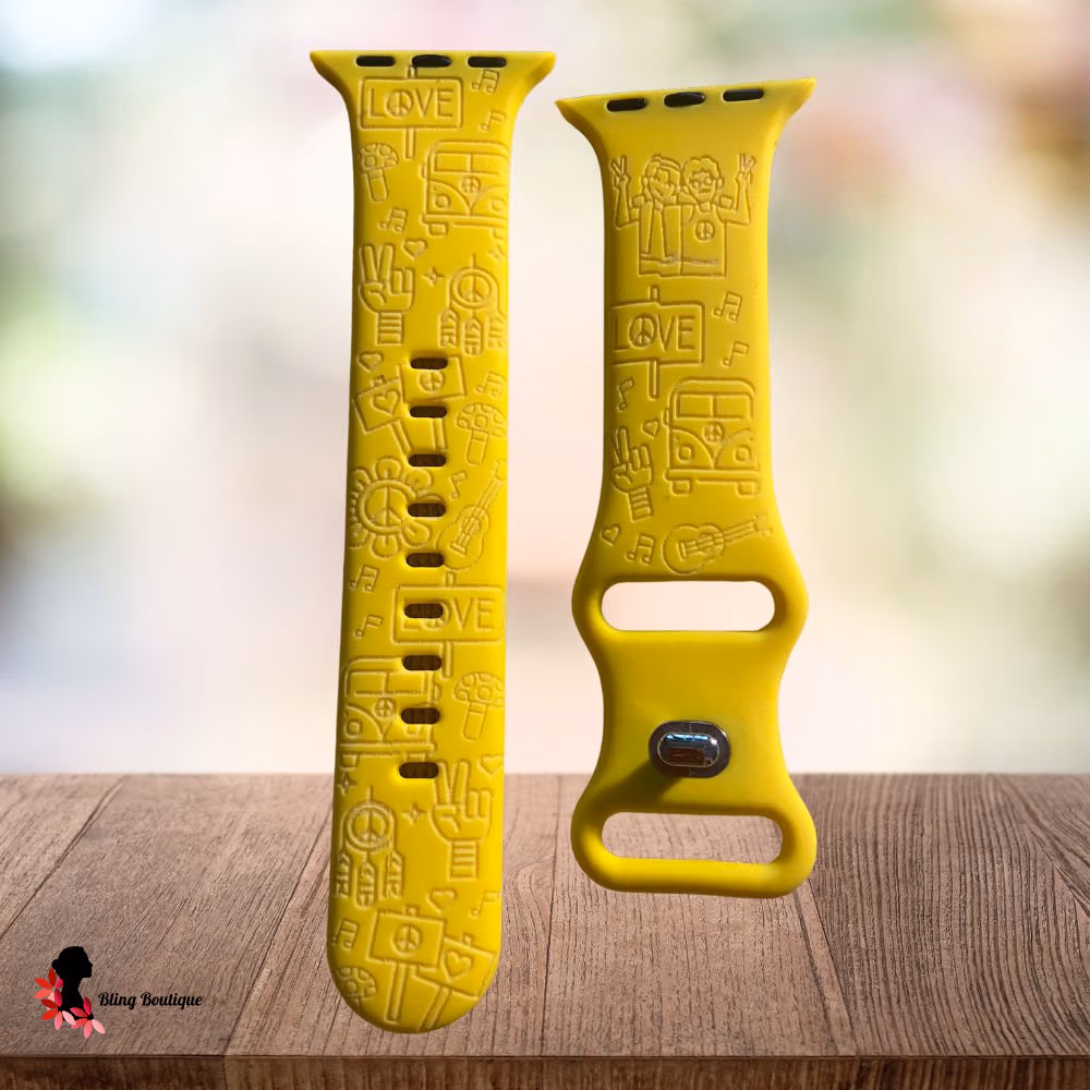 This cute yellow watchband is compatible with Apple Watch 38 mm, 40 mm, 41 mm, 42 mm, 44 mm, 45 mm, 46 mm, and 49 mm. Watchband is a breathable soft silicone sports strap for iWatch Ultra, 10, 9, 8, 7, 6, 5, 4, 3, 2, 1, and SE series.
