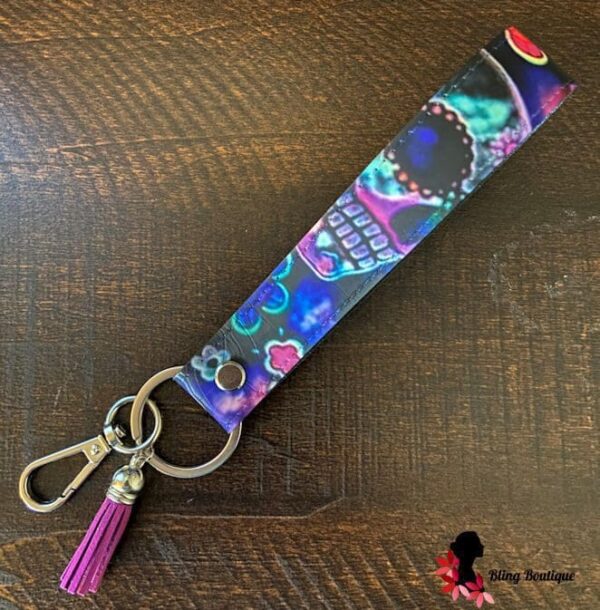 This beautiful leather wristlet has skulls and flowers on both the front and back. Beautifully designed to hold your keys and then some.